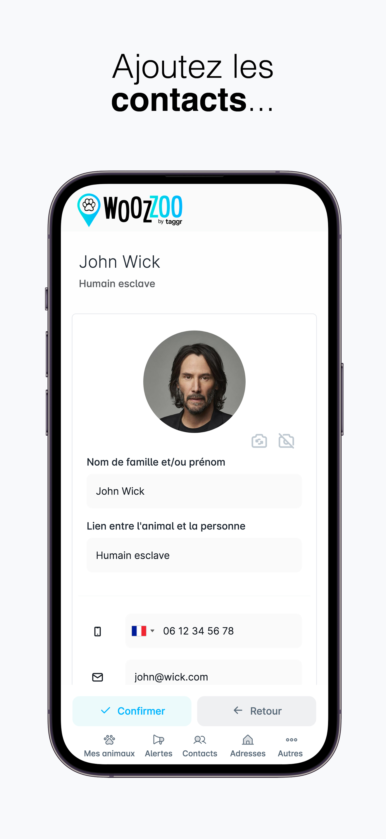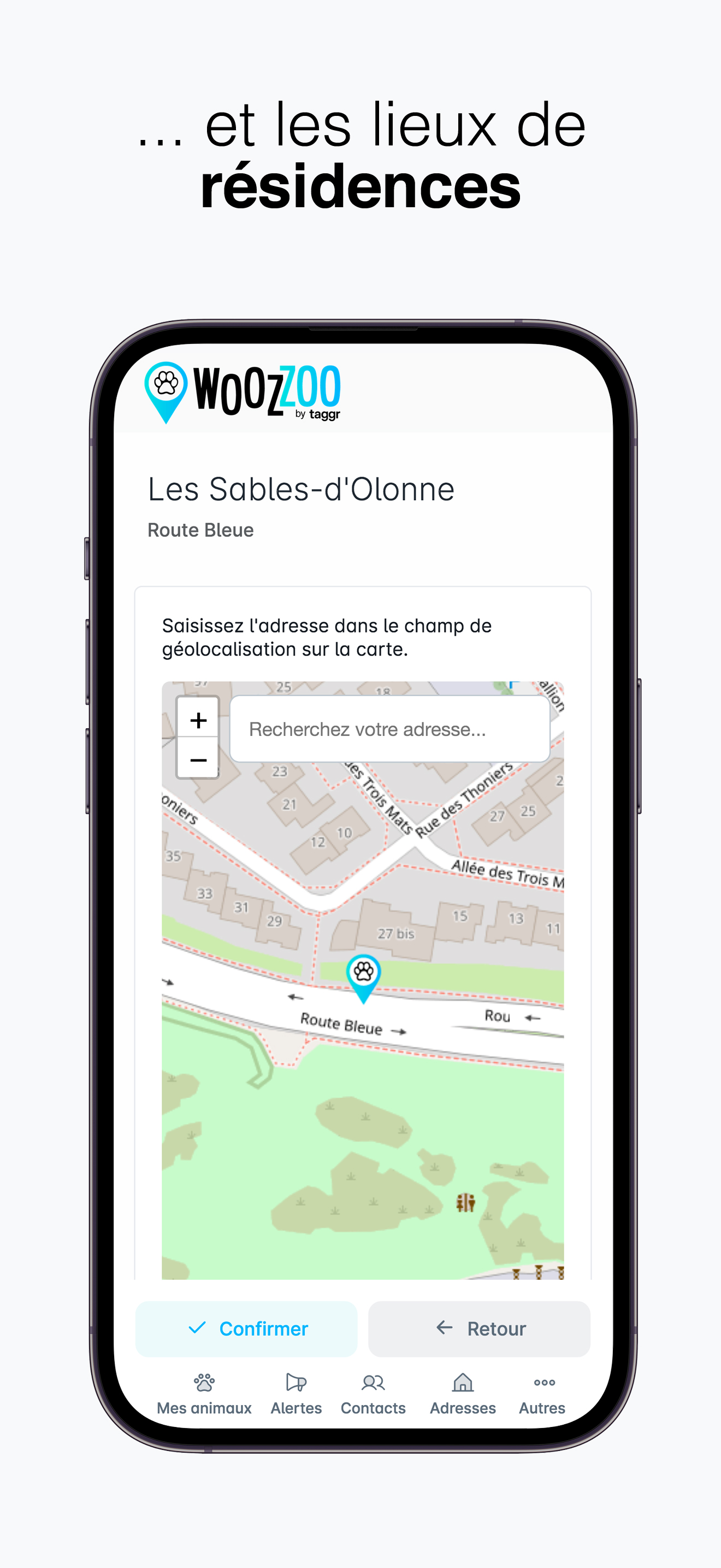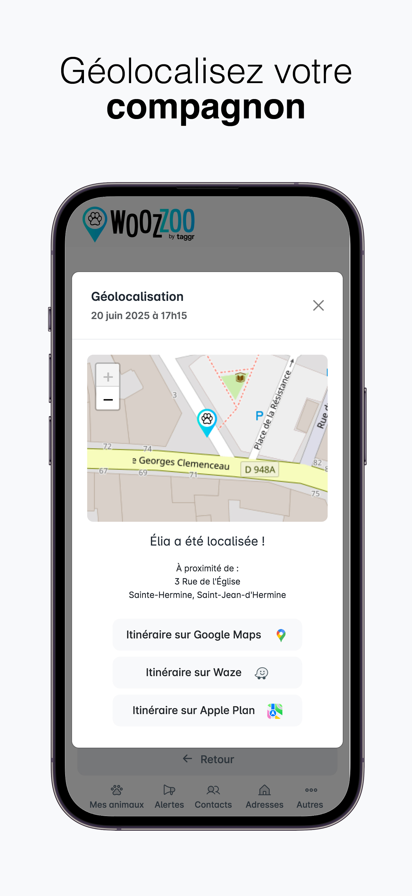 Des informations de contacts, partagées uniquement en cas d'errance de l'animal et une localisation GPS précise lors de la consultation de son profil.