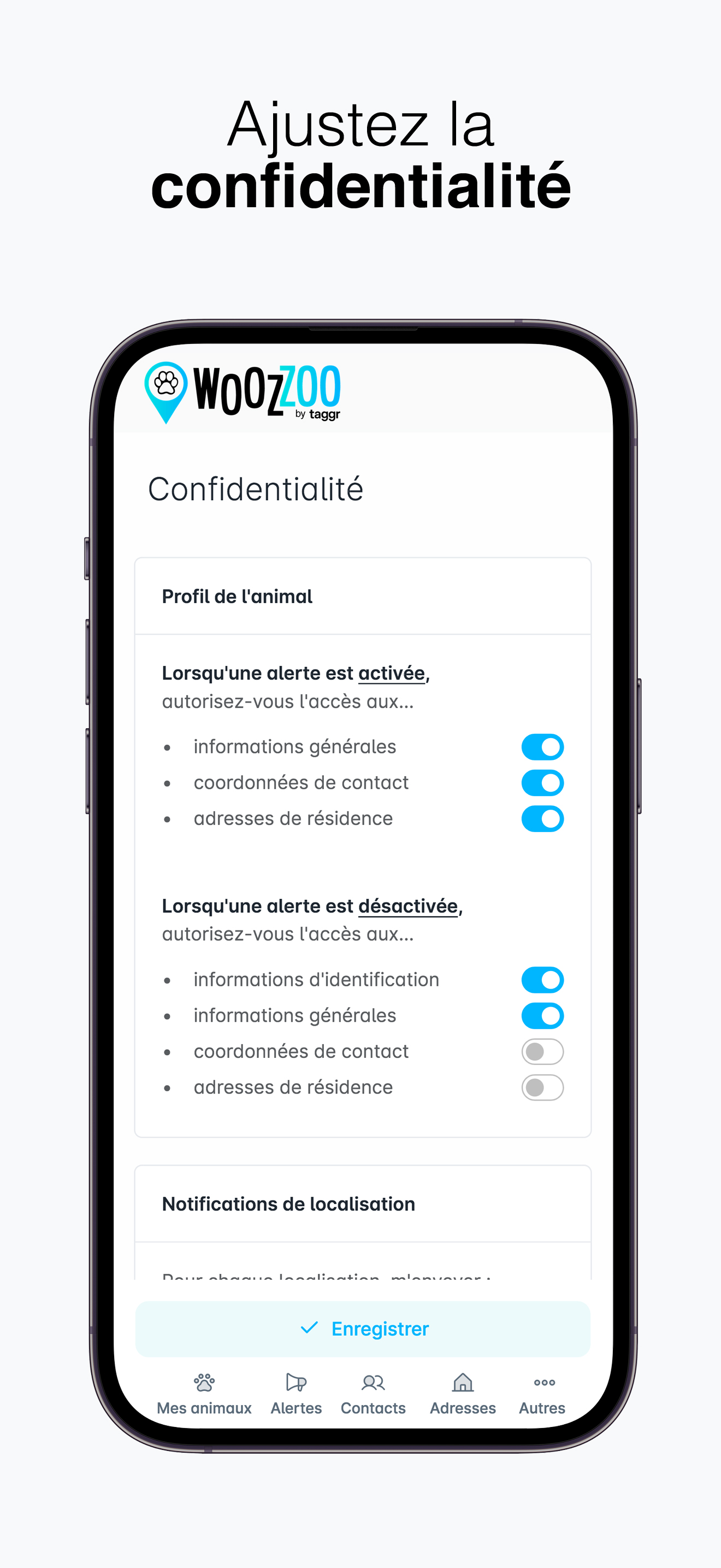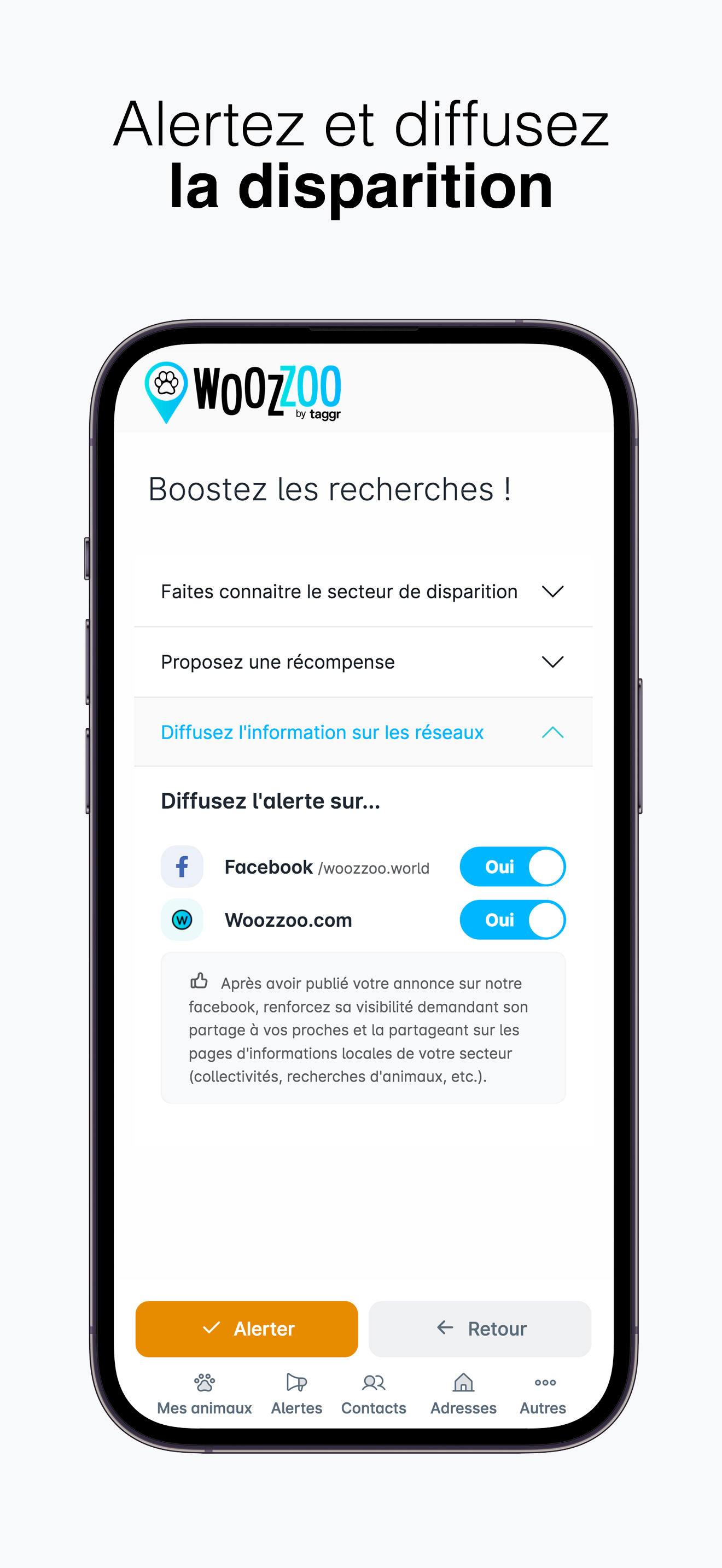 L'application woozzoo.com offre une gestion affinée de diffusion de vos informations personnelles avec la possibilité d'afficher un maximum d'information lorsqu'une alerte disparition de l'animal est émise, puis de restreindre celles-ci automatiquement lorsque votre compagnon est simplement en promenade.